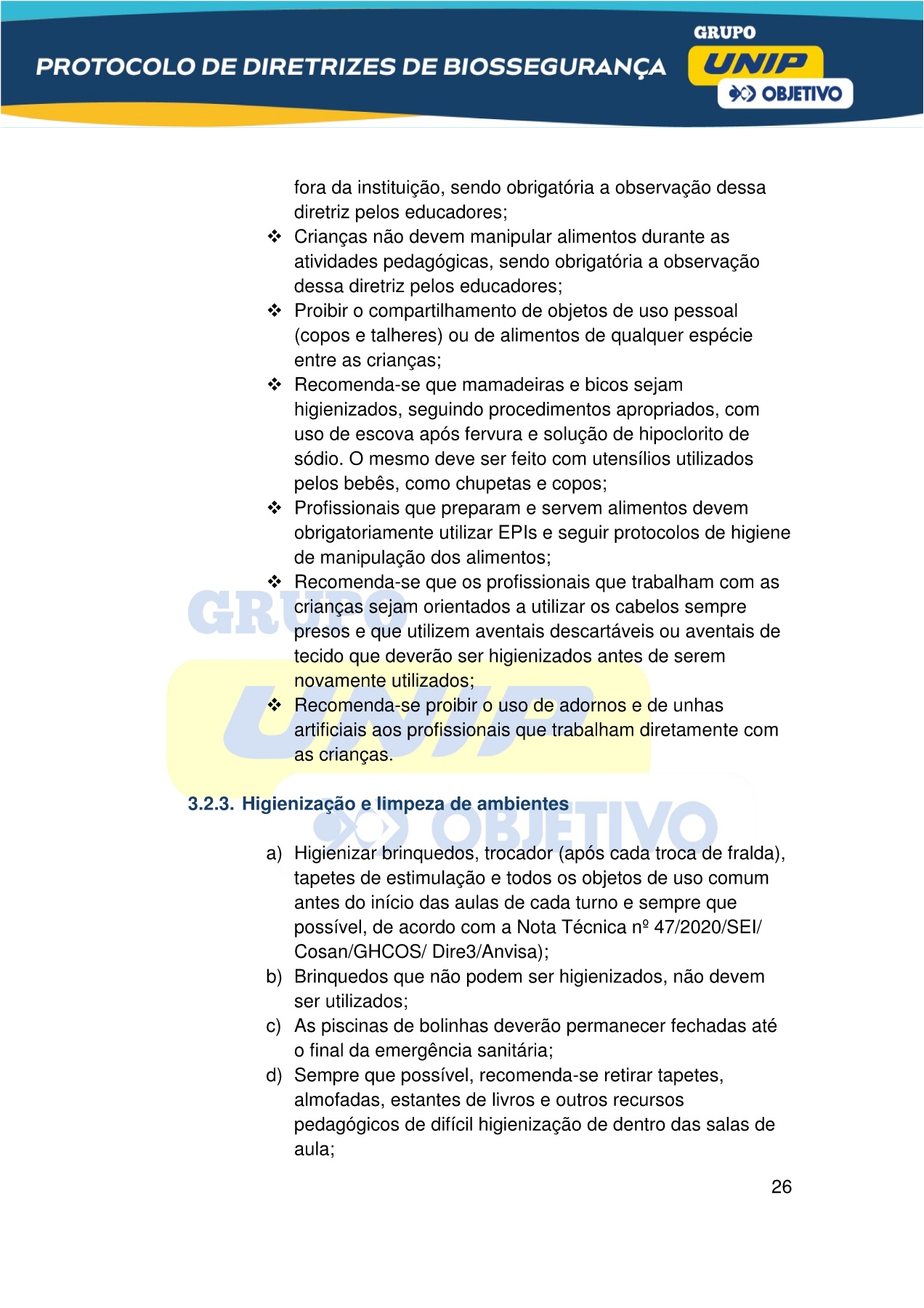 a) Higienizar brinquedos, trocador (após cada troca de fralda), tapetes de estimulação e todos os objetos de uso comum antes do início das aulas de cada turno e sempre que possível, de acordo com a Nota Técnica nº 47/2020/SEI/Cosan/GHCOS/ Dire3/Anvisa);