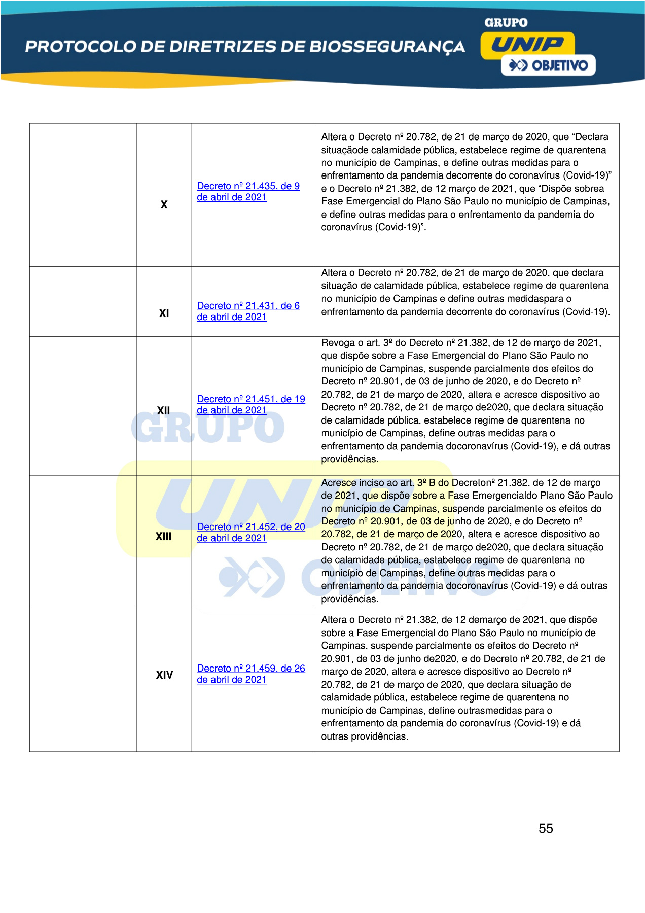 | XIV | Decreto nº 21.459, de 26 de abril de 2021 | Altera o Decreto nº 21.382, de 12 de março de 2021, que dispõe sobre a Fase Emergencial do Plano São Paulo no município de Campinas, suspende parcialmente os efeitos do Decreto nº 20.901, de 03 de junho de 2020, e do Decreto nº 20.782, de 21 de março de 2020, altera e acresce dispositivo ao Decreto nº 20.782, de 21 de março de 2020, que declara situação de calamidade pública, estabelece regime de quarentena no município de Campinas, define outras medidas para o enfrentamento da pandemia do coronavírus (Covid-19) e dá outras providências. |